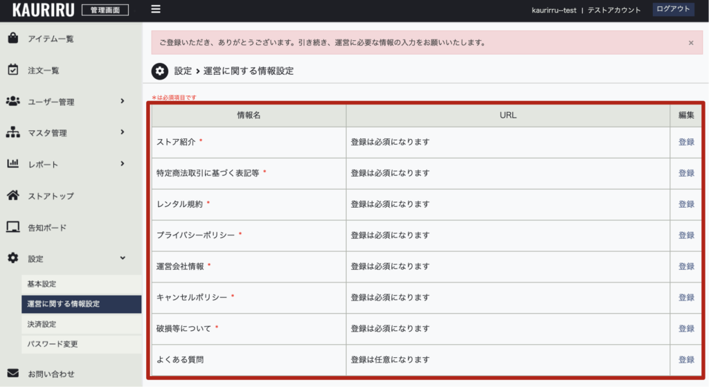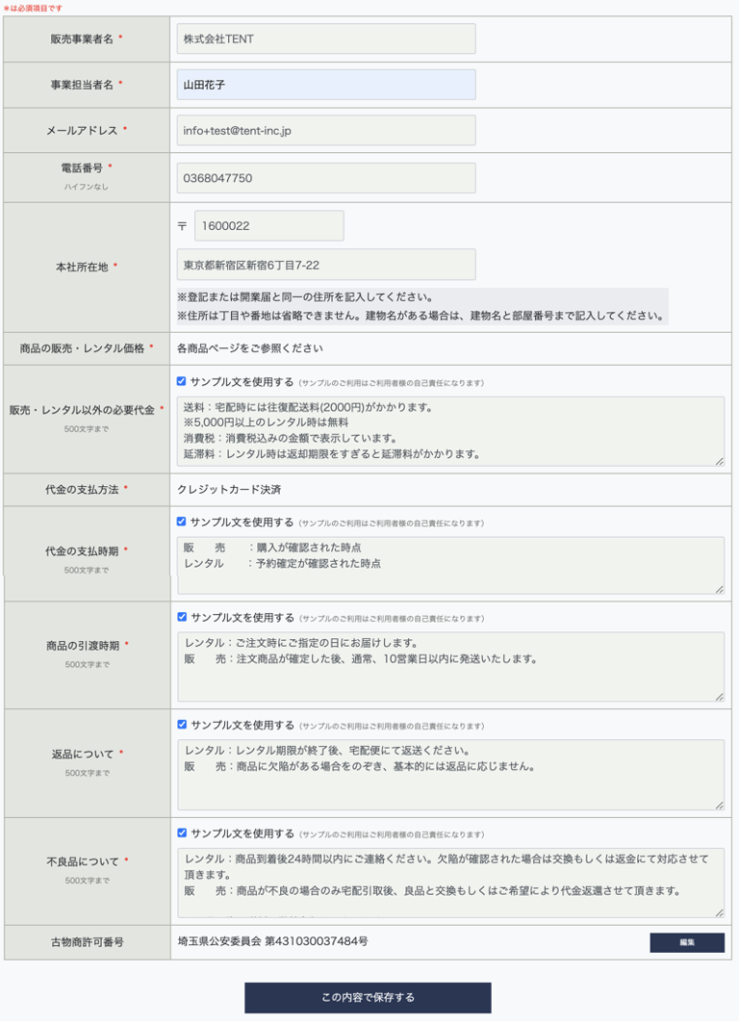 このステップではレンタルストア運営に必要な「特定商法取引法に基づく表記」や「レンタル規約」などを設定します。