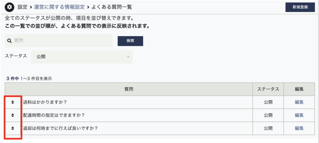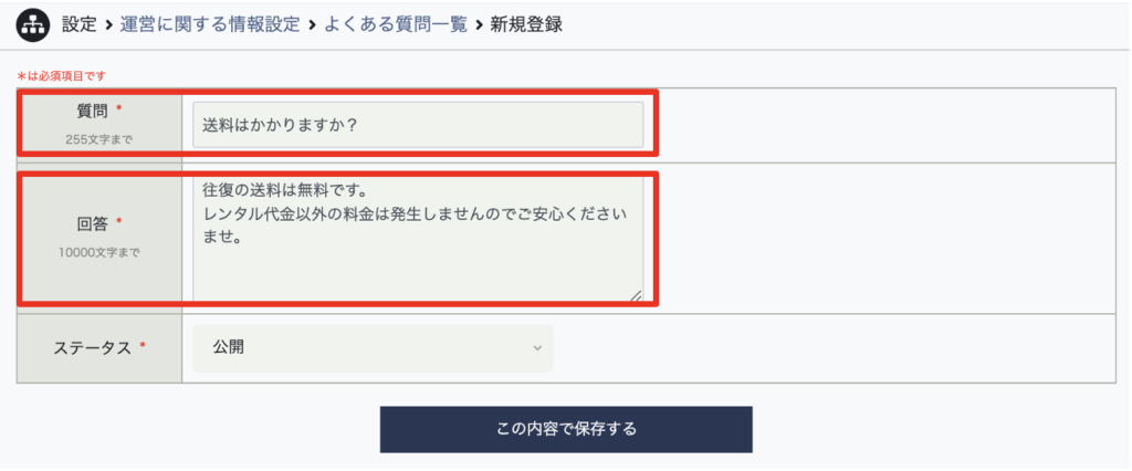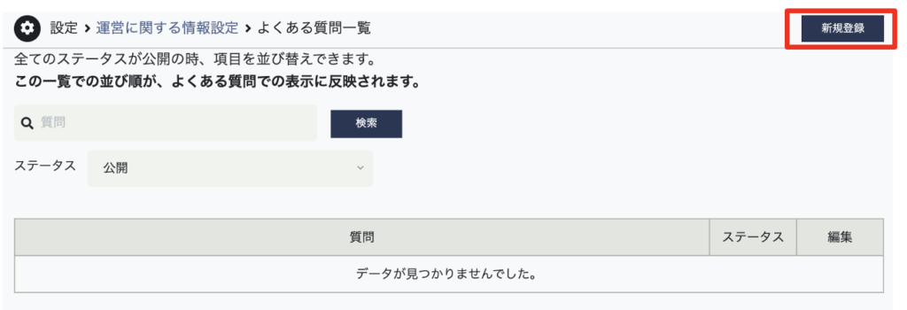カウリル管理画面の「設定>運営に関する情報設定>よくある質問」より下記手順でご入力ください。