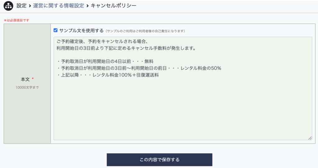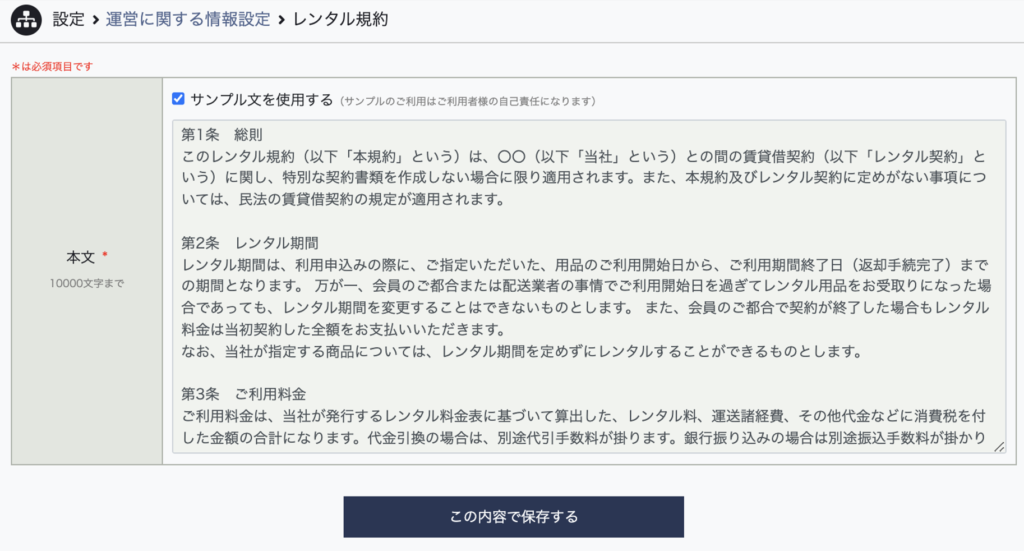 レンタル期間やキャンセルについてなど、レンタルについて御社が定める規約を記載します。