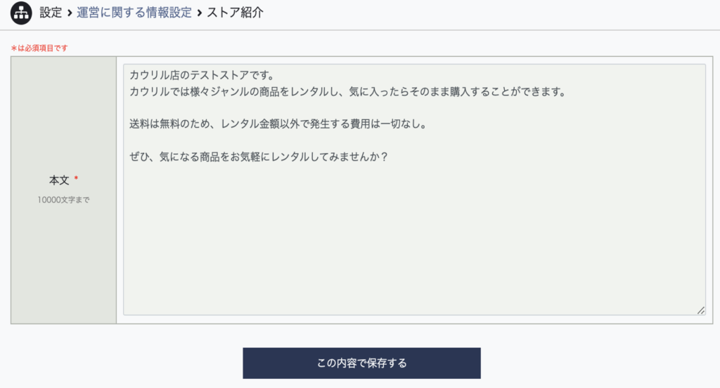 カウリル管理画面の「設定>運営に関する情報設定>ストア紹介」にて文章を作成し、取扱商品やサービスの魅力をお客さまへ届けましょう。