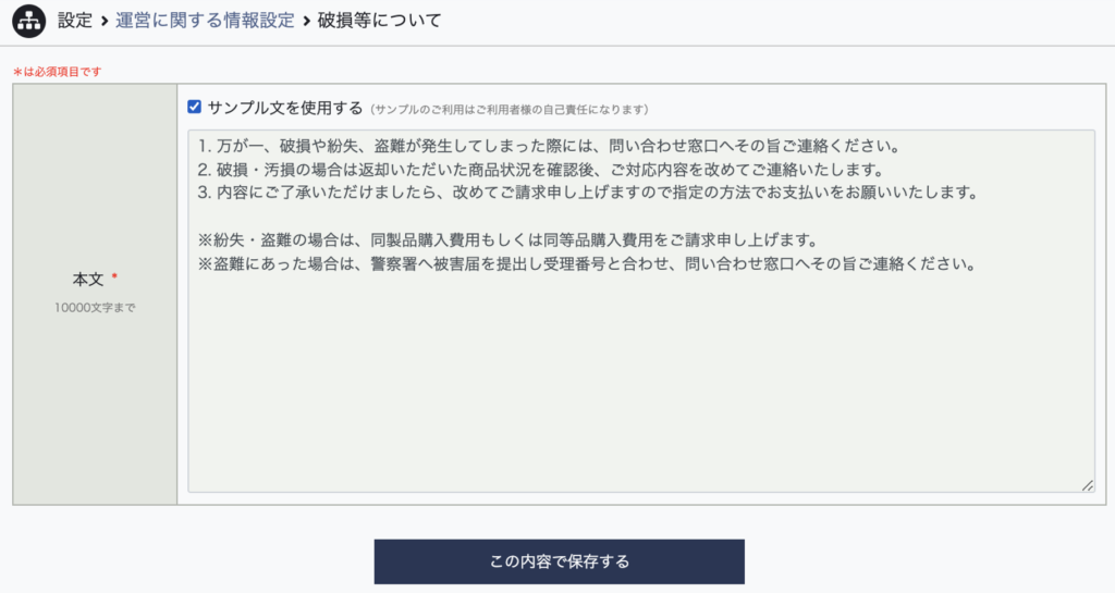 カウリル管理画面の「設定>運営に関する情報設定>破損等について」よりご入力してください。