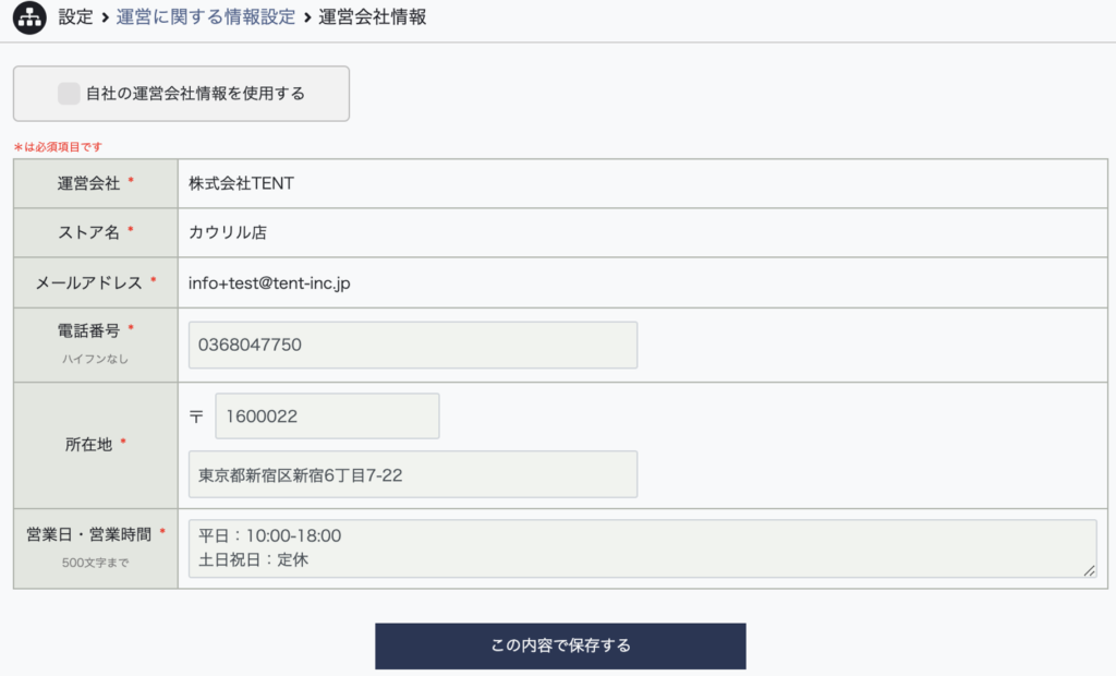 カウリル管理画面の「設定>運営に関する情報設定>運営会社情報」よりご入力してください。