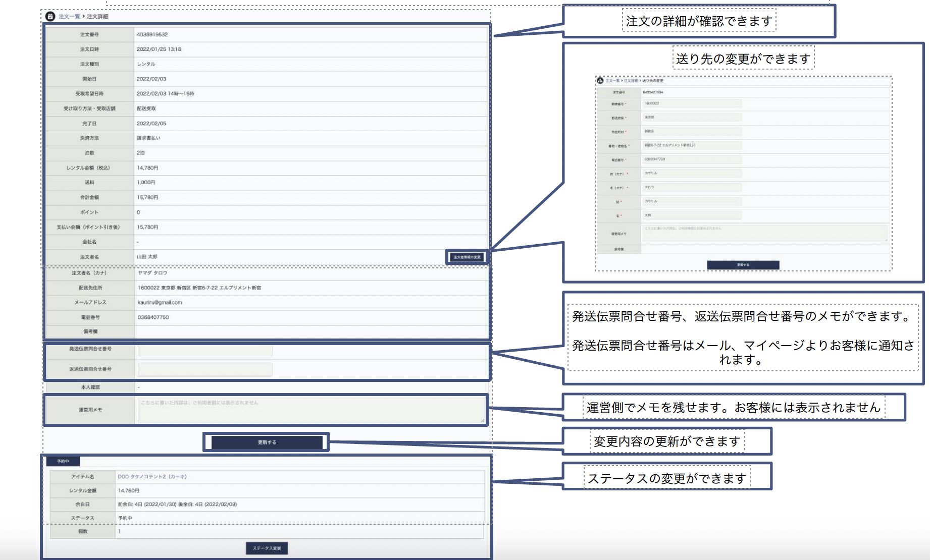 注文管理 注文管理:注文詳細 注文管理:注文詳細 注文管理画面>注文番号をクリックで「注文詳細」画面が開きます。 「注文詳細」画面では、お客さまの個人情報の確認・変更や予約アイテムの閲覧、予約状況のステータス変更ができます。