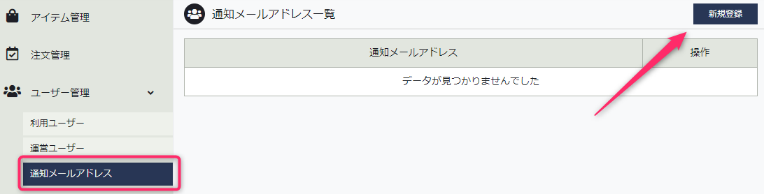 管理画面>ユーザー管理>通知メールアドレス>新規登録